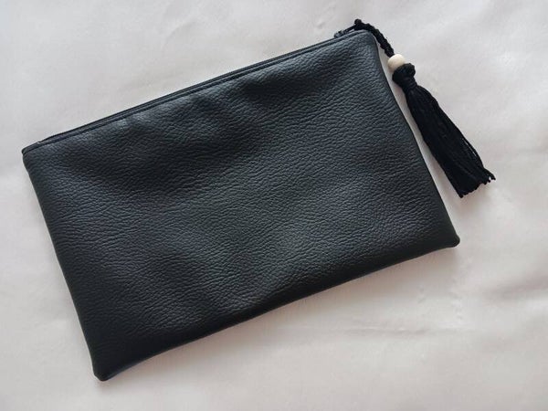 Pochette en similicuir noir avec une jolie touche de tissu wax, doublée à l'intérieur avec le même tissu
